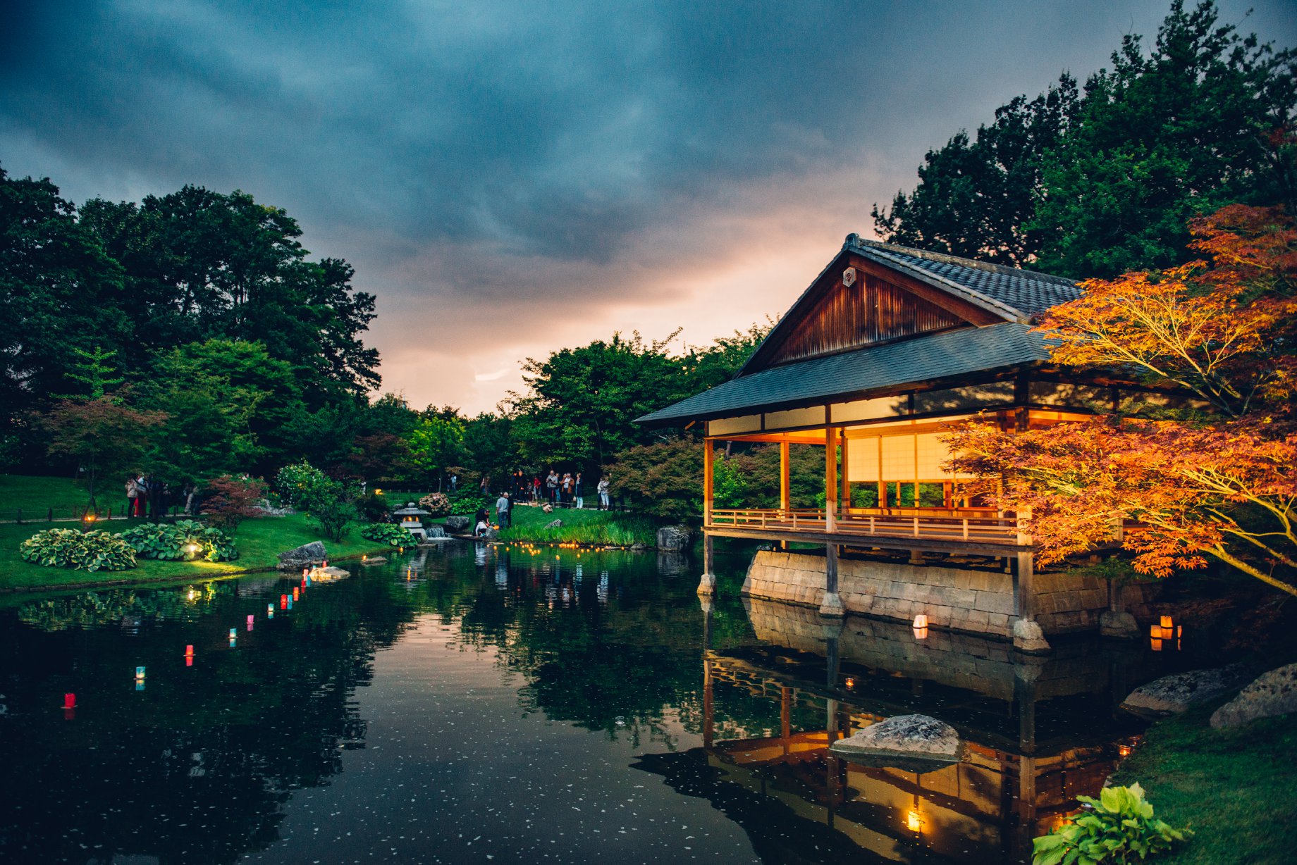 Dalej, przechodząc po kamieniach blisko spadającej wody, spacerowicze podążają drewnianym mostem symbolizującym drogę do raju i nieśmiertelności, by w końcu odkryć japońskie pawilony, w których kilka razy w roku organizowana jest tradycyjna ceremonia parzenia herbaty. Stąd rozpościera się widok na staw wypełniony kolorowymi, imponujących rozmiarów rybami koi. Wszak woda jest niezbędnym elementem w klasycznym ogrodzie japońskim, wnosząc do niego życie i ruch. Uważni obserwatorzy dostrzegą tu również kamienne latarnie i ścieżki ułożone z pojedynczych płaskich kamieni.