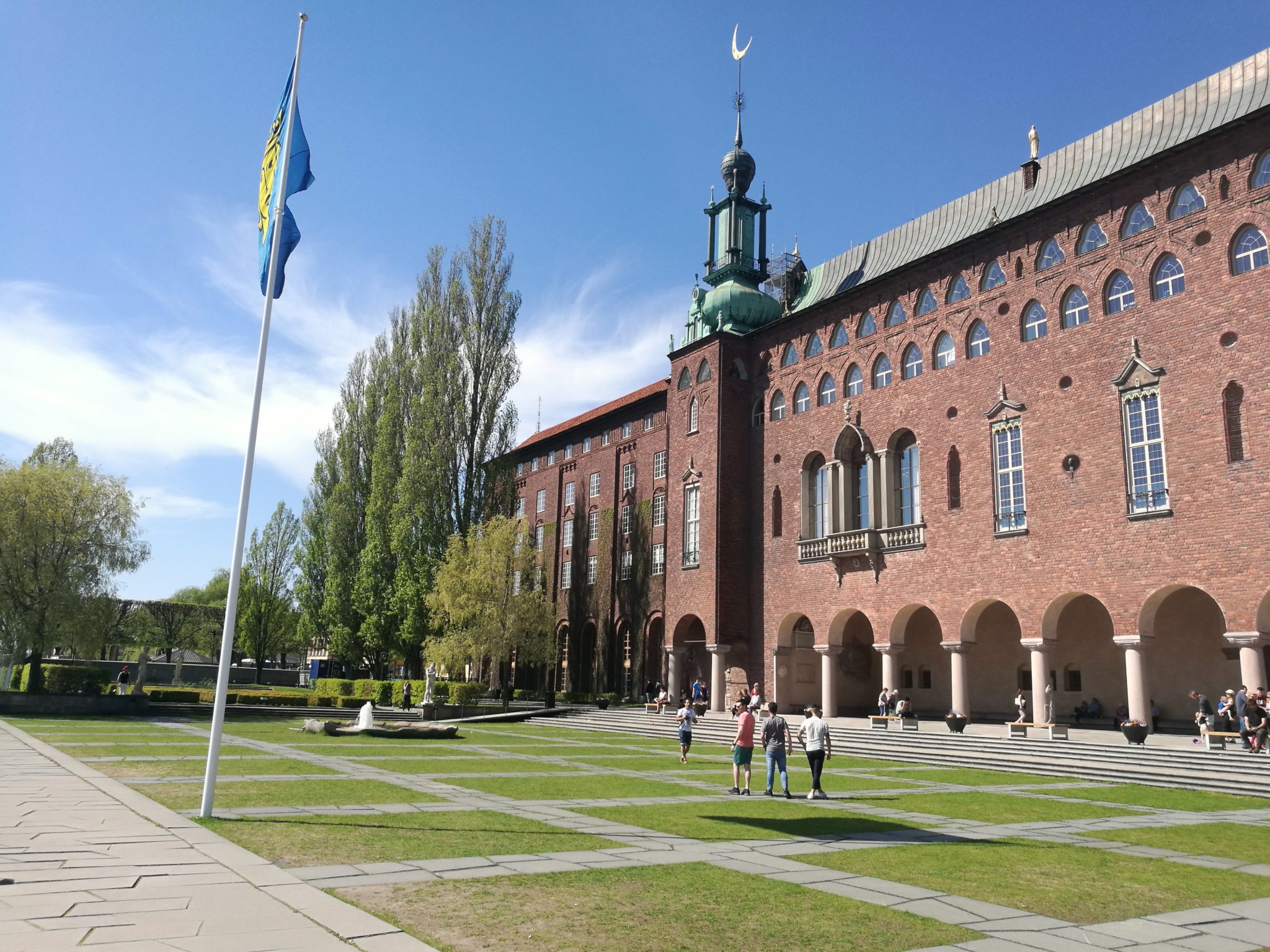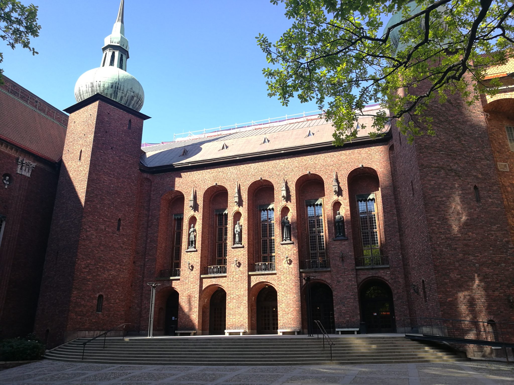 Pierwszym punktem programu był ratusz miejski (Stadhuset), który już z daleka prezentował się imponująco. Połyskujące złotem trzy korony (herb i symbol Sztokholmu) okazały się świetnym punktem orientacyjnym. Ta pochodząca z początku XX w. budowla powstała pod wpływem zachwytu weneckim Pałacem Dożów. Stadhuset jest absolutnym „must visit”, ponieważ to tu 10 grudnia każdego roku wydawane są przyjęcia na cześć laureatów Nagrody Nobla z udziałem króla i królowej Szwecji. Poza tym odwiedzających zachwyci zapewne widok z