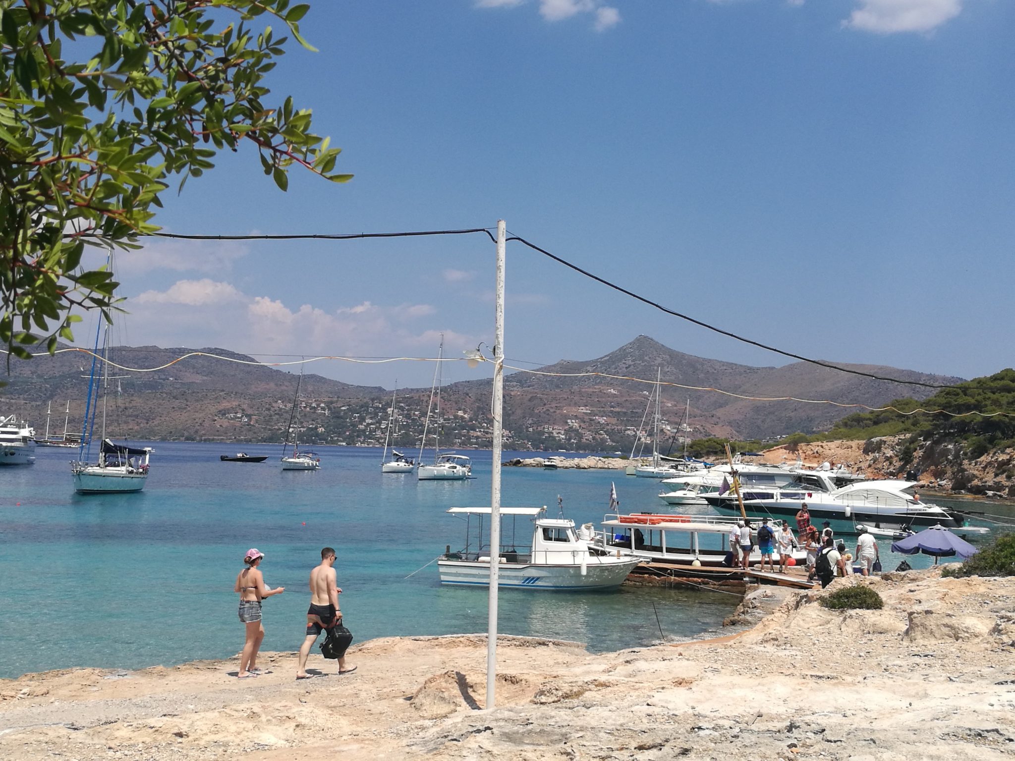 Egina jest również fajnym miejscem dla lubiących podróże, ponieważ  pozwala odwiedzić pobliskie wyspy. Warto wybrać się w rejs na Poros. Statek wypływa z Eginy i zatrzymuje się najpierw na wyspie Methana, która – szczerze mówiąc – nie zachwyciła mnie z pokładu statku. Wygląda na dość nudną – poza wysadzanym palmami nadmorskim deptakiem i poza kilkoma hotelami nie dostrzegłam nic więcej. To miejsce słynie z łaźni siarkowych, więc z pewnością jest warte odwiedzenia przez mających problemy reumatyczne. Ale Methana może być ciekawa dla spędzających wakacje na jachcie – przed dopłynięciem do portu znajduje się piękna zatoczka i plaża. To miejsce do odpoczynku w ciszy i degustacji owoców morza w „La playa Seaside”, które nawet z daleka wygląda zachęcająco.
