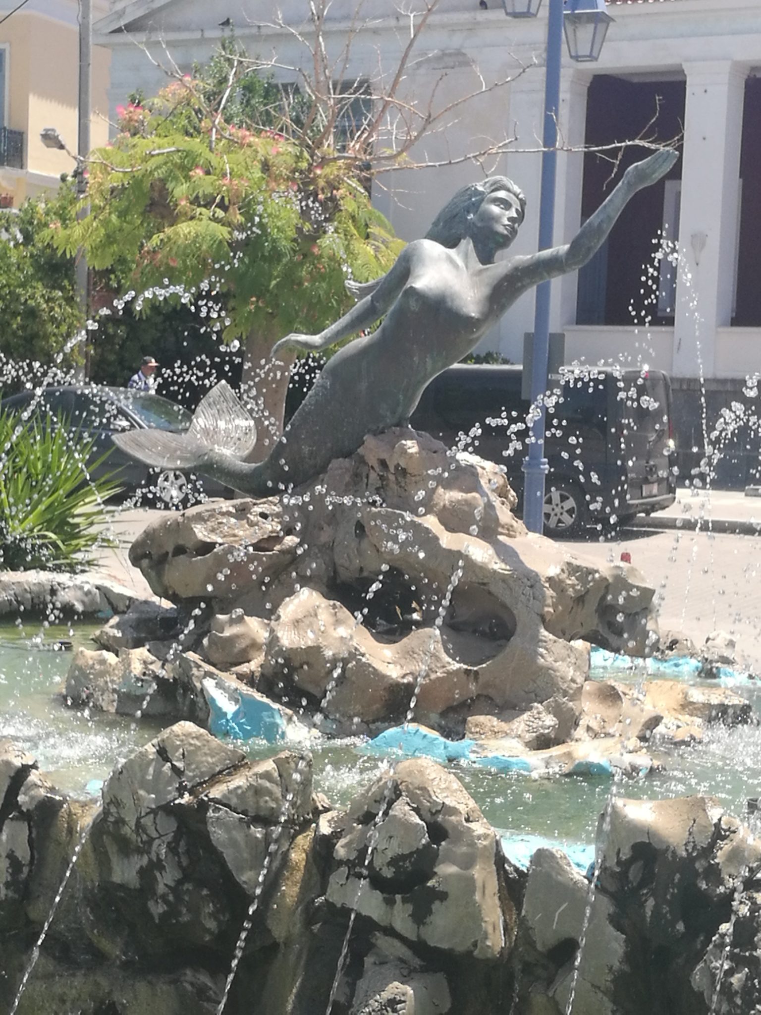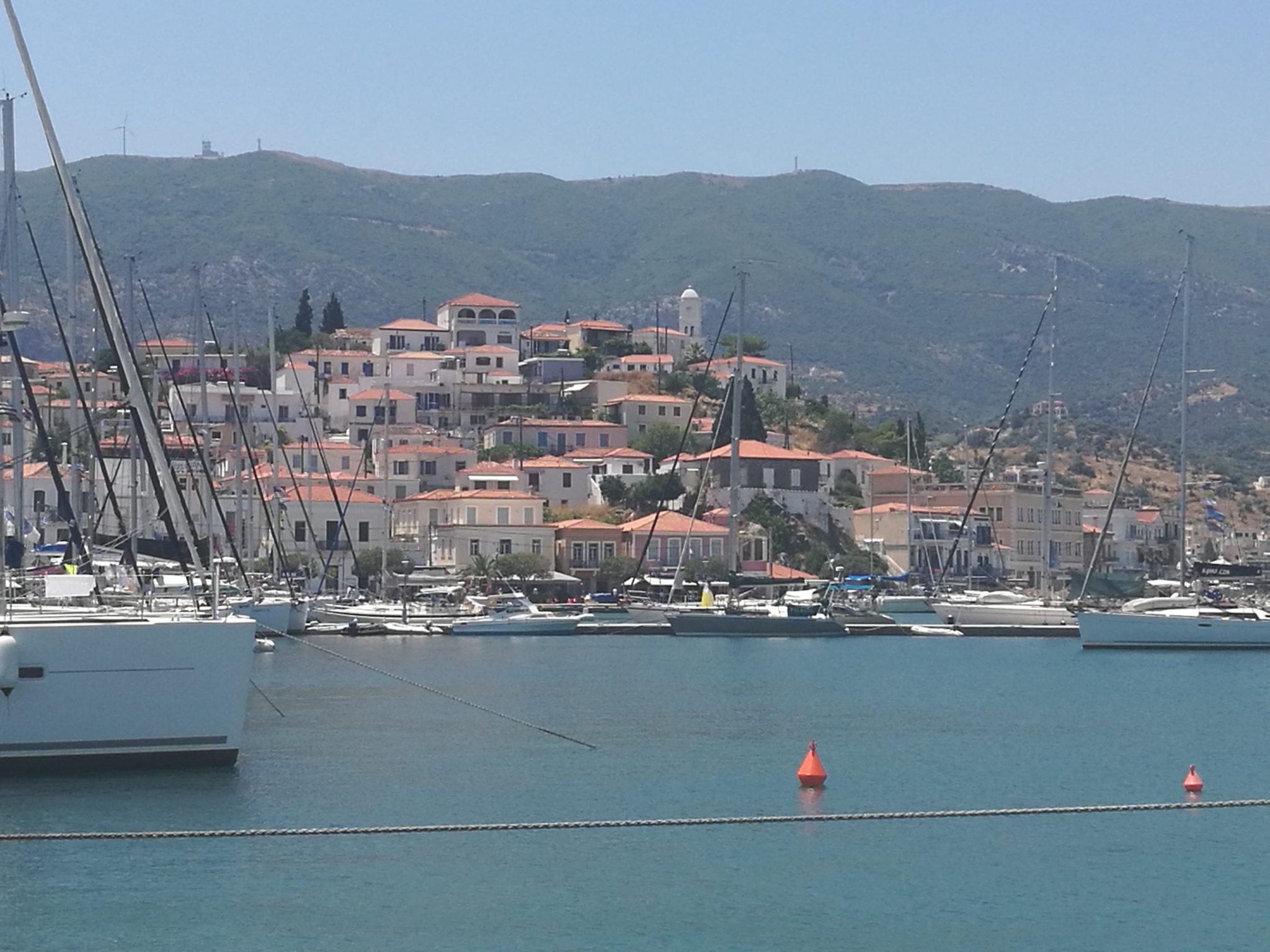 I wreszcie Poros. Dopływając do portowego miasta, które jest zarazem stolicą, na myśl przychodzi Dubrownik domy również pokryte są czerwonymi dachami. Po zejściu na ląd prawie od razu można się natknąć na fontannę syrenki, ale tym, co przyciąga jak magnes, jest widoczna już z daleka neoklasycystyczna wieża zegarowa z 1927 r. będąca punktem rozpoznawczym wyspy. Tuż obok niej łopocze grecka flaga świetnie komponująca się z kolorem morza i nieba oraz bielonymi
