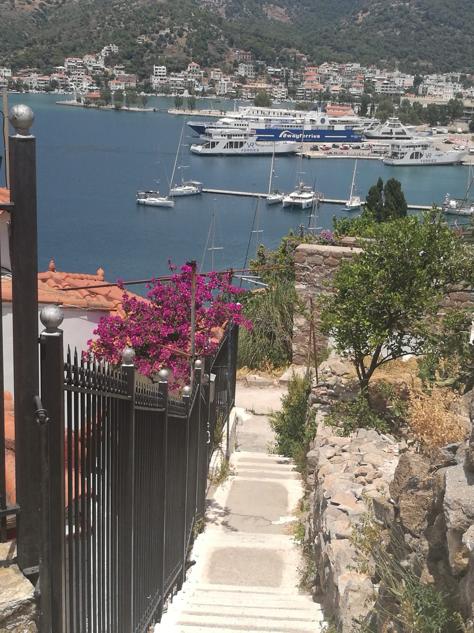 greckimi domami. Ale aby dotrzeć do wieży, trzeba odbyć spacer pod górę i pokonać labirynt wąskich uliczek oraz wysokie schody. Zapewniam jednak, że warto – po dotarciu do celu warto choć na chwilę wejść do wnętrza wieży, aby zza szyby zobaczyć mechanizm zegarmistrzowski. Poza tym, właśnie ze szczytu rozciąga się piękna panorama wyspy. Po nasyceniu oczu pięknymi widokami schody zaprowadzą wprost na długie nabrzeże pełne tawern, barów, restauracji i sklepików z pamiątkami. Nie pozostaje nic innego, jak usiąść w którymś z lokali gastronomicznych tuż nad brzegiem morza i uraczyć się greckimi specjałami.