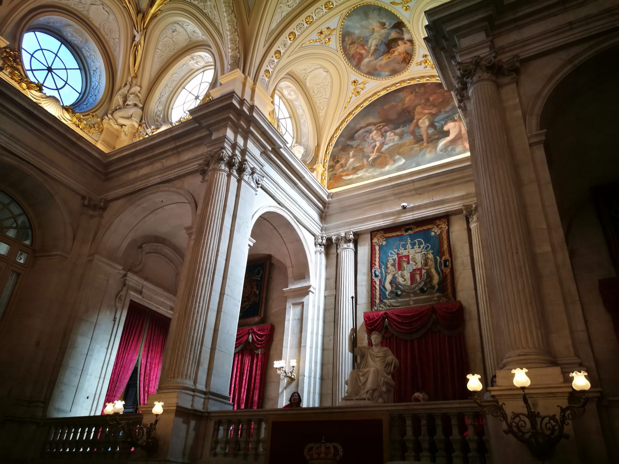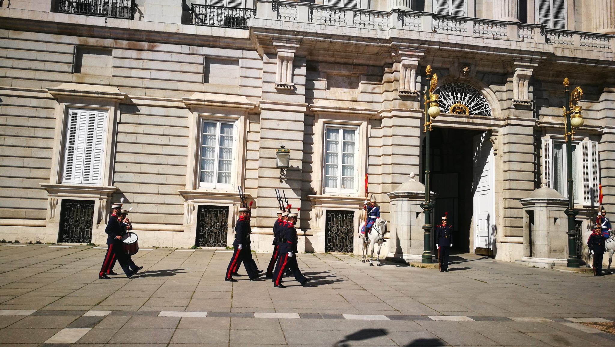 Free Walking Tour kończy się przed wejściem do imponującego pałacu królewskiego Palacio Real, który polecam zobaczyć! Budowla pochodzi w XVIII w. i jest ogromnym gmachem liczącym ponad 3 tysiące (!) pomieszczeń. Hiszpańska rodzina królewska, na czele której stoi w chwili pisania tego tekstu król Filip VI Burbon i jego żona Letycja, tu nie mieszka, a pałac wykorzystywany jest do wizyt dyplomatycznych. Z tego powodu jest dostępny dla zwiedzających tylko wówczas, gdy nie goszczą tu wielcy tego świata. Mnie akurat dopisało szczęście i moim udziałem stało się zwiedzenie 23 komnat (tylko tyle jest