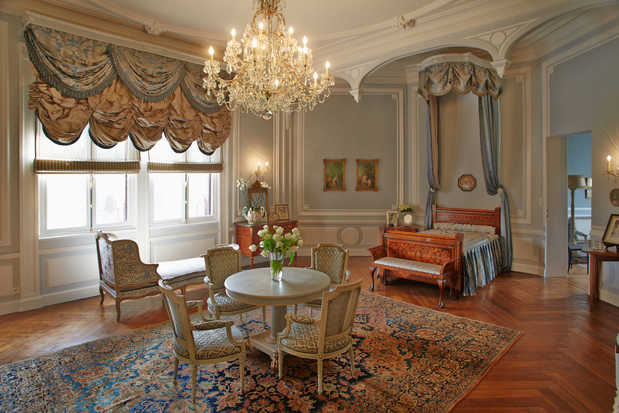 Na dużym kominku znajduje się porcelana z Delft, a tuż obok portrety hrabiego de Hornes i hrabiego d’Egmont, o którym pisałam tutaj, w tekście poświęconym zamkowi Gaasbeek. Z Galerii Gobelinów rozciąga się piękny widok na zamkowy ogród. Pasjonatów epoki napoleońskiej z pewnością zachwyci pokój w stylu empire, a wisienką na torcie będzie neogotycka kaplica, w której odbywają się chrzty, komunie i pogrzeby członków rodziny.